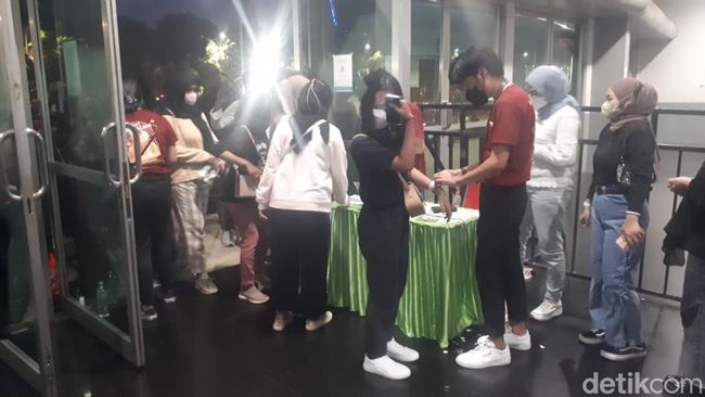 Dua penonton asal Surabaya, Yulis (14) dan Amel (17) antre masuk pukul 17.00 WIB. Mereka berdua sama-sama menunggu penampilan Arsy Widianto.