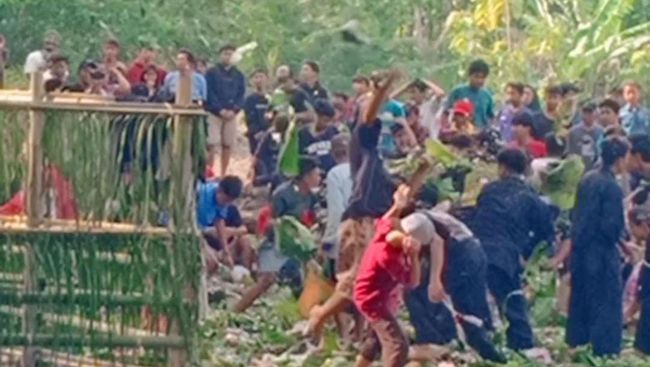 Pantauan detikJatim, ratusan warga utamanya pria tampak aksi saling lempar nasi yang dibungkus daun pisang. Tak hanya nasi, warga juga melempar sayur lodeh yang dibungkus plastik dan juga mie.