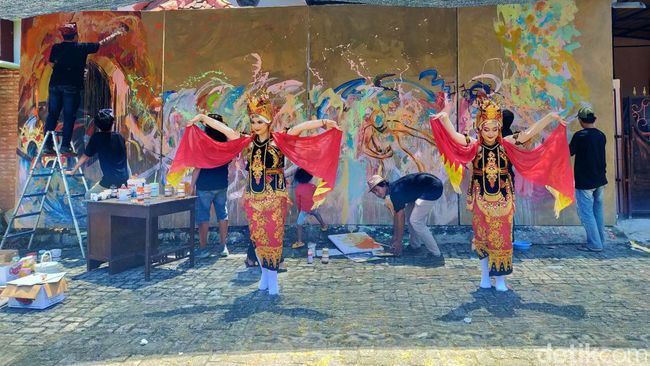 Perayaan Hari Seni Rupa Banyuwangi itu digelar di Yayasan Langgar Art, Perumahan Griya Wiyata, Kelurahan Tukangkayu, Sabtu (10/12/2022). Mereka melukis langsung penari Gandrung yang sedang menari di belakang para perupa Banyuwangi tersebut.