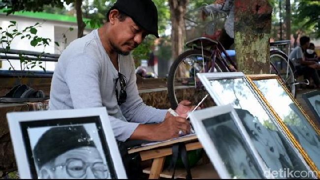 Dengan peralatan gambarnya, buruh pabrik pengolahan kayu berusia 55 tahun itu secara konsisten membuka lapaknya. Bukan dengan gerobak atau kios, dia hanya menggelar tikar, mengeluarkan hasil karya sketsanya sebagai portofolio, dan mulai menggoreskan pensil di atas kanvas.