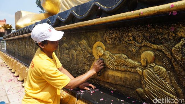 Patung Buddha tidur di Maha Vihara Mojopahit menjadi yang terbesar di Indonesia. Permukaan fondasi patung ini dihiasi relief. Mungkin belum banyak yang tahu cerita yang tersirat pada relief tersebut.