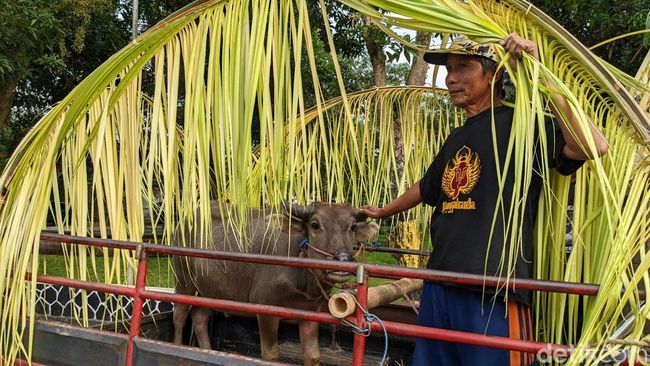 Seekor kerbau dikirab lintas kecamatan menjelang puncak upacara adat nyadran atau bersih Dam Bagong, Trenggalek. Usai dikirab, kerbau akan disembelih untuk disedekahkan.