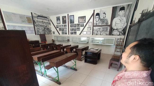 Terpampang juga di dinding kelas itu sejumlah foto tokoh-tokoh nasional. Salah satunya foto Soekarno kecil saat bersama ayah dan ibunya, Soekeni dan Nyoman Rai Srimben.