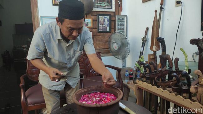"Kami rutin setiap tahun, tepatnya saat Satu Suro atau satu Muharram selalu memandikan benda-benda pusaka seperti keris dan tumbak," kata Wildan di rumahnya, Rabu (19/7/2023).