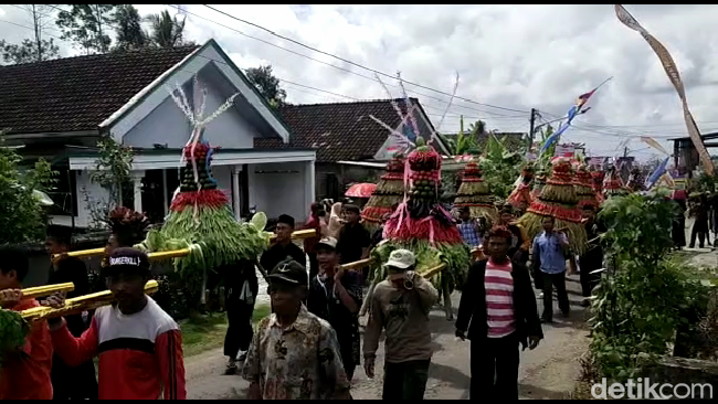 Sebelum diperebutkan, puluhan gunungan hasil pertanian dan buah buahan serta kepala sapi ini diarak keliling kampung menuju lokasi sumber mata air di lokasi wisata hutan bambu.