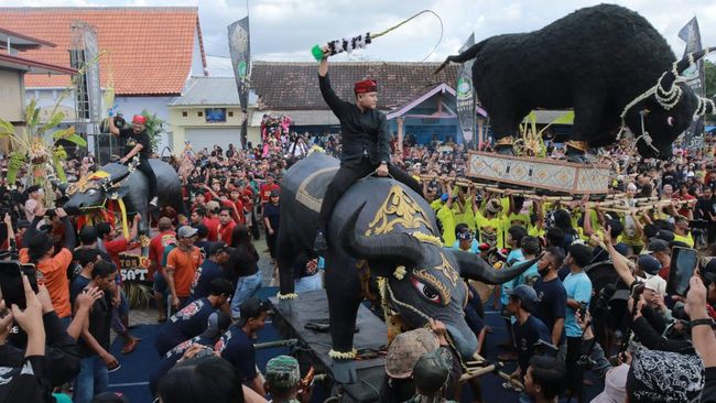 Seekor kerbau raksasa dipanggul ribuan warga didampingi dua ekor kerbau berukuran lebih kecil yang ditunggangi 2 orang lelaki berpakaian serba hitam. Kedua lelaki itu membawa cemeti di tangan masing-masing.