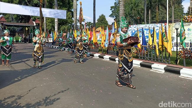 Pantauan detikJatim, ratusan perangkat Desa dan Kecamatan di Kabupaten Blitar mengikuti proses Pisowanan Agung yang dimulai dari Alun-Alun Kota Blitar, Sabtu (5/8/2023). Rombongan kemudian berjalan menuju pendopo membawa panji atau bendera.