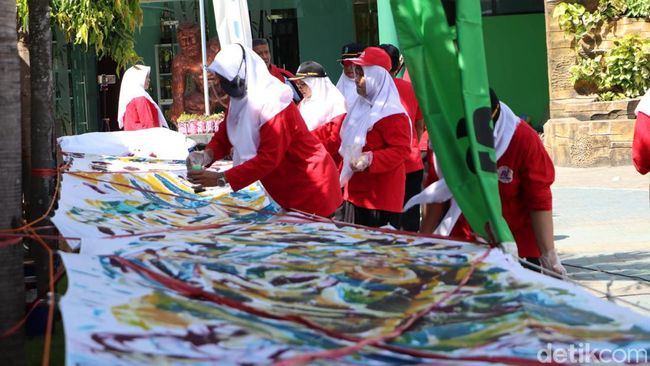 Pantauan detikjatim, selain para siswa, cukup banyak warga sekitar yang turut turut membatik bersama. Mereka tampak senang bisa berpartisipasi memberikan warna di kain batik.