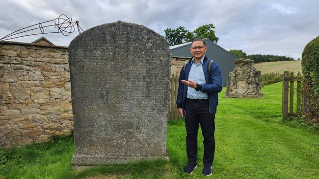 Aries datang ke lokasi prasastri Sangguran di Minto Estate, Senin (28/8/2023). Pria yang juga Kepala Dinas Pendidikan Provinsi Jatim itu ditemani mahasiswa Indonesia di London yakni Ghassan dan mahasiswa indonesia di Edinburgh Munawir.