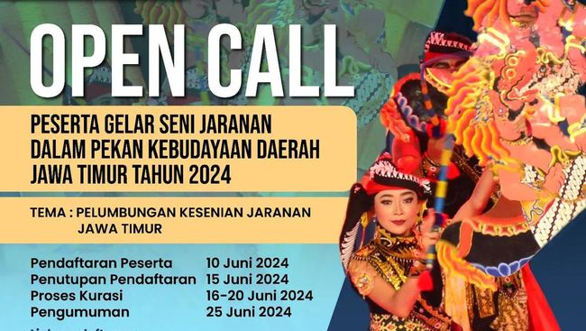 - Tim kurator akan melaksanakan seleksi pada 17-20 Juni 2024, dan pengumuman 10 grup/kelompok/komunitas/organisasi kesenian jaranan yang terpilih akan dilaksanakan pada 25 Juni 2024 melalui Instagram @disbudparjatimprov dan @bpk_wilayah_11.