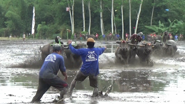 Para petani di Desa Sumberjo, Kecamatan Sukodono, Lumajang menggelar tradisi karapan kerbau di area persawahan. Kerbau-kerbau yang biasanya digunakan untuk membajak sawah ini akan diadu kecepatannya dalam arena berlumpur sepanjang 400 meter.