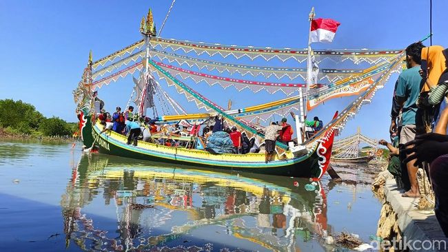 Mereka hendak menghantarkan sesajen yang berisikan kepala sapi hingga buah-buahan yang dikemas dalam sebuah miniatur perahu.