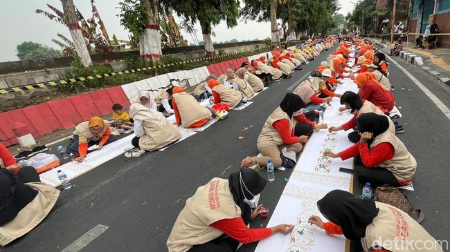 Sehingga panjang kain batik tersebut mencapai 5.053 meter. Ribuan peserta secara serentak mewarnai kain batik tersebut dengan pewarna yang sudah mereka siapkan. Tak ayal aksi mewarnai batik terpanjang dengan peserta terbanyak ini sukses memecahkan rekor MURI.