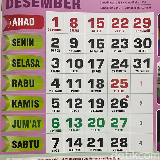 Ada lima hari pasaran dalam kalender Jawa, yaitu Pahing, Pon, Wage, Kliwon, dan Legi. Penggabungan hari dan pasaran disebut weton. Berikut pasaran Jawa hari ini, Jumat 12 Desember 2024 lengkap dengan wetonnya.