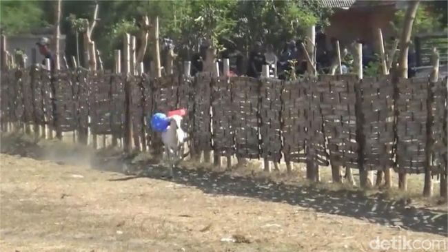 Suara gemerincing kaleng yang diikat di ekornya membuat kambing berlari kencang. Kambing yang tercepat mencapai garis finish akan dinyatakan sebagai pemenang.