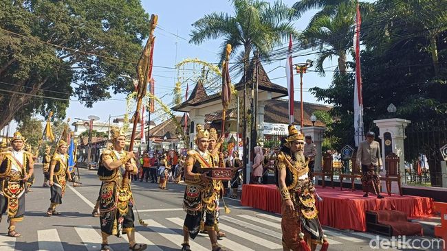 Pantauan detikJatim di lokasi, ratusan perangkat Desa dan Kecamatan di Kabupaten Blitar mengikuti proses Pisowanan Agung, Selasa (5/8/2025). Kirab itu dimulai dengan upacara pasukan di Alun-alun Blitar, dilanjutkan dengan iringan rombongan perangkat desa/kecamatan menuju Pendopo RHN.