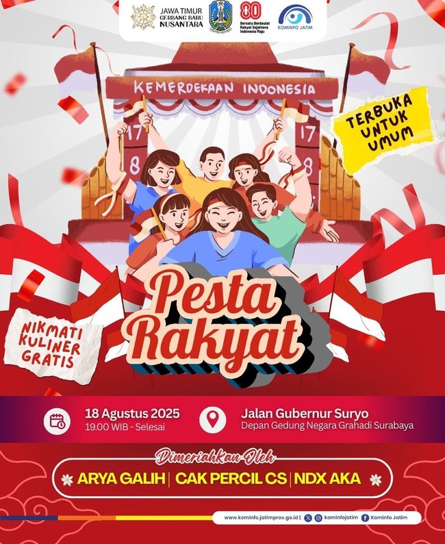Puncaknya, hari ini Senin (18/8/2025), Pemprov Jatim menggelar pesta rakyat dengan menghadirkan bintang tamu NDX A.K.A, Jihan Audy, Cak Percil, hingga Arya Galih. Acara ini akan berlangsung di depan Gedung Negara Grahadi, tepatnya di Jalan Gubernur Suryo, Surabaya.