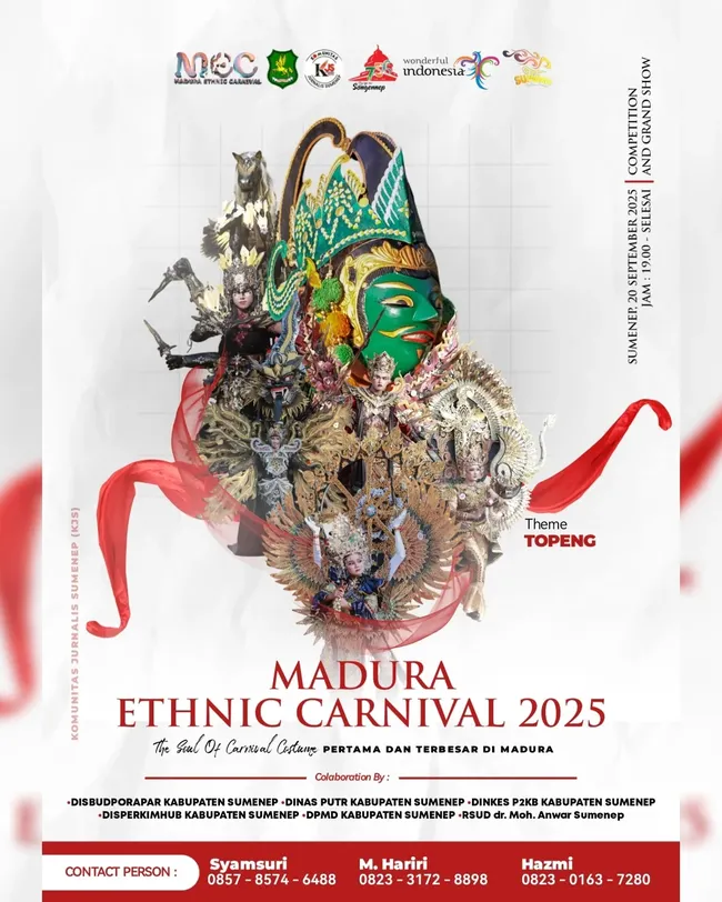Kabupaten Sumenep kembali bersiap menyambut salah satu event budaya, Madura Ethnic Festival (MEC) 2025. Acara ini akan digelar pada 20 September 2025 di Sumenep dengan tema spesial "The Soul of Carnival Costume" yang menonjolkan kekayaan seni Topeng Dalang Sumenep.