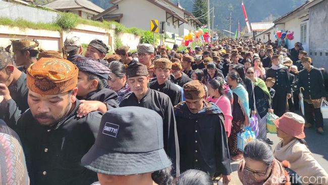 Probolinggo - Warga Suku Tengger menggelar tradisi Nyadran pada Jumat (19/8/2022). Mereka bersedekah untuk leluhur, dengan cara menaruh sesaji di atas kuburan lalu mendoakan.