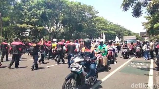 Massa buruh yang demo datang dengan membawa kendaraan dan memenuhi jalan protokol Surabaya dari Bundaran Waru hingga A Yani/Foto: Deny Prastyo. Utomo/detikJatim