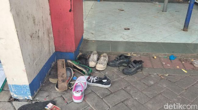 Sepatu milik para korban Tragedi Kanjuruhan yang masih berserakan di stadion (Foto: Deny Prastyo Utomo/detikJatim)