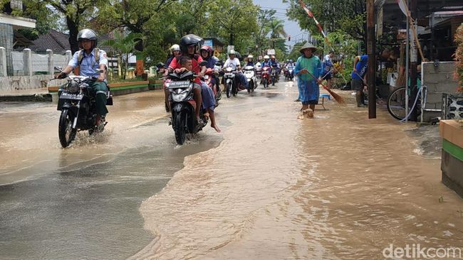 Pacitan - Banjir melanda Jalan Ahmad Yani depan Taman Makam Pahlawan Pacitan, Rabu (12/10/2022). Saat ini, genangan banjir masih ada yang mencapai 40 cm.