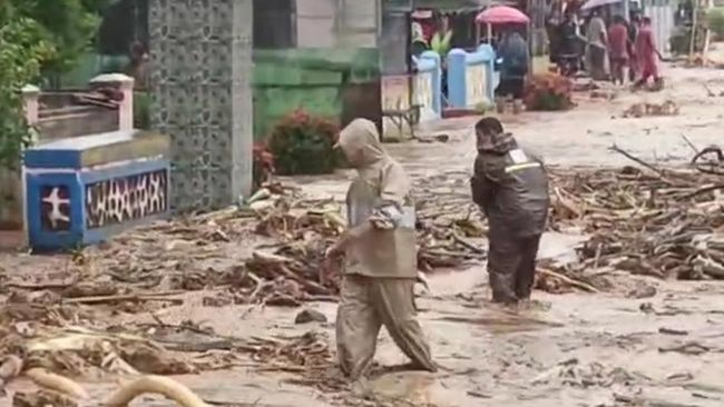 Malang - Banjir bandang melanda Desa Pujiharjo, Kecamatan Tirtoyudo, Kabupaten Malang, Senin (17/10/2022). Jalan desa seperti aliran sungai.
