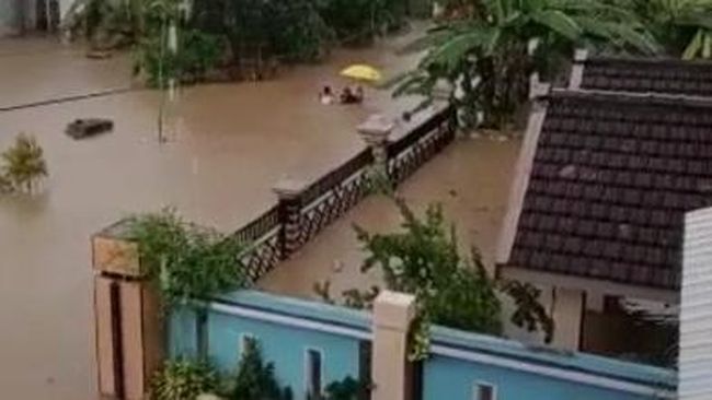 Blitar - Banjir melanda Desa Bacem, Kecamatan Sutojayan, Blitar, Senin (17/10/2022). Dalam video amatir yang beredar, ada banjir yang nyaris sampai atap rumah.