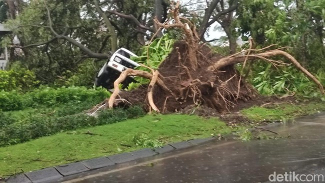 Sidoarjo - Puting beliung menyapu sebagian wilayah Sidoarjo, Pukul 14.40 WIB, Minggu (23/10). Ratusan rumah rusak dan puluhan pohon tumbang hingga tercabut dari akarnya.