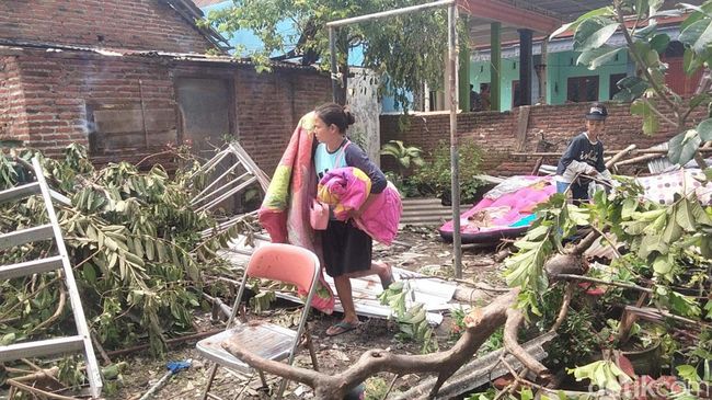 Sidoarjo - Puting beliung menerjang Dusun Mlaten, Desa Sidokepung, Kecamatan Buduran, Sidoarjo, Minggu (23/10/2022). Warga mengais rumah menyelamatkan barang berharga.