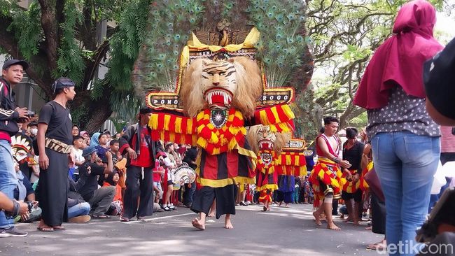 Malang - Ada seni Jaranan, Bantengan hingga Reog di sekitar Alun-alun Tugu Kota Malang, Minggu (11/12/2022). Suguhan ini dalam Gelar Agung Jaranan Malang Raya.
