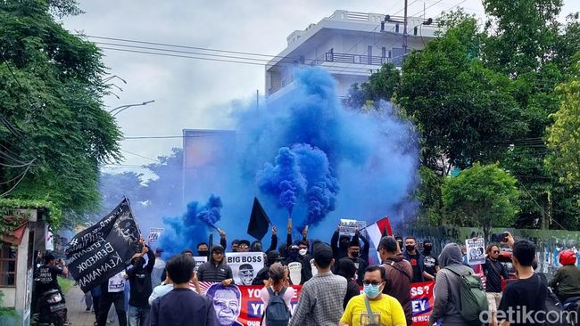 Kota Malang - Puluhan Aremania mendatangi kantor Arema FC di Jalan Mayjen Panjaitan, Kota Malang. Massa menyampaikan orasi dan menyegel kantor Arema FC