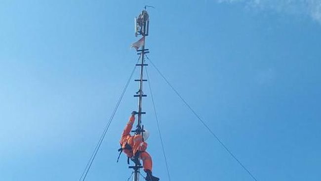 Petugas memanjat tiang pemancar wi-fi untuk mengevakuasi ular yang nangkring di atas tiang (Foto: Istimewa/Command Center 112)