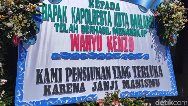 Malang - Karangan bunga korban penipuan robot trading ATG Wahyu Kenzo memenuhi halaman Polresta Malang Kota. Beberapa karangan bunga itu punya pesan ngenes nan kocak.