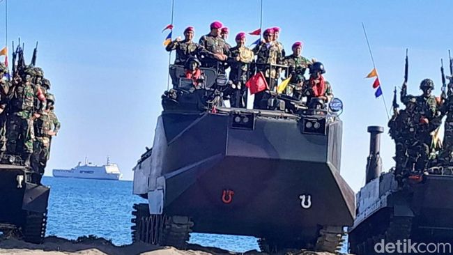 Situbondo - TNI menggelar latihan perang yang melibatkan semua matra di Situbondo. Latihan gabungan ini ditinjau langsung sejumlah pejabat salah satunya Mahfud Md.
