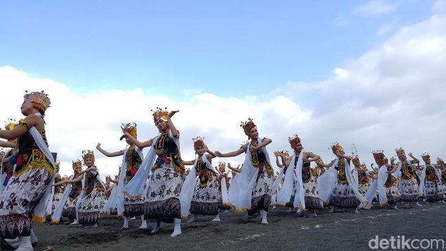 Banyuwangi - Festival Gandrung Sewu kembali digelar di Pantai Boom, Banyuwangi tahun ini. Sebanyak 1.200 penari dan 150 talenta pendukung sukes memukai ribuan penonton.