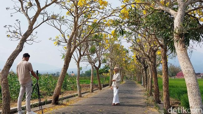 Kota Batu - Pesona Tabebuya di lokasi wisata Bumi Lumbung Pendem, Kota Batu mulai bermekaran. Bunga tabebuya berwarna kuning itu membuat nuansa indah kota wisata.