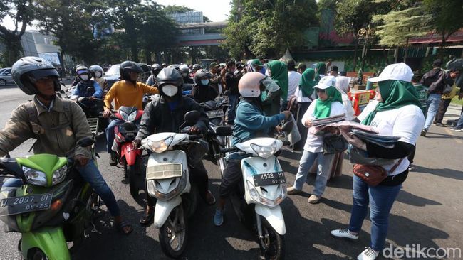 Sejumlah Kader PKB dari DPC maupun DPW kompak membagikan krudung dan kaos kepada pengguna di Jalan Wonokromo, saat pasangan Anies baswedan dan Muhaimin Iskandar daftar ke KPU.