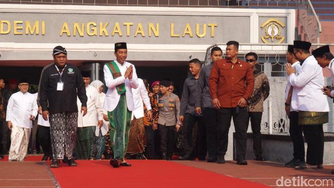 Surabaya - Presiden Joko Widodo menghadiri acara ijzah Kubro dan pengukuhan pengurus puat Pagar nusa di lapangan Bumi Moro, Minggu (22/10/2023).