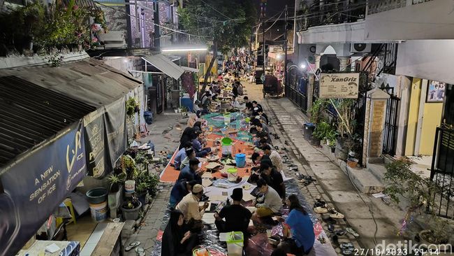 Surabaya - Warga Lidah Wetan, Kecamatan Lakarsantri, Surabaya menggelar Sedekah Bumi, Jumat (27/10) malam. Ribuan tumpeng berjajar di sepanjang jalan tersebut.