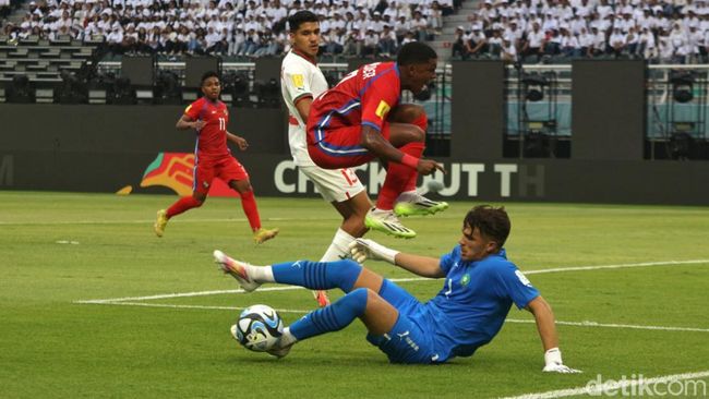 Aksi pemain Timnas Panama saat berupaya membobol gawang Maroko di laga pembukaan Piala Dunia U-17 Stadion GBT Surabaya. (Foto: Deny Prasto/detikJatim)