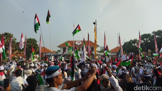 Surabaya - Samudra manusia tampak di sekitar Jalan Gubernur Suryo, tepatnya di depan Gedung Negara Grahadi Surabaya. Mereka mengikuti Aksi Solidaritas untuk Palestina.