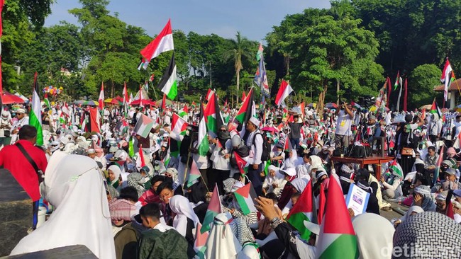 Siodarjo - Ribuan orang memenuhi Alun-alun Sidoarjo. Mereka melakukan aksi solidaritas membela Palestina,Minggu(19/11/2023).