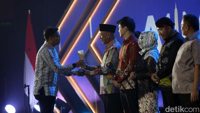 Wakil Pemimpin Redaksi detikcom Ardhi Suryadhi memberikan penghargaan kepada H.M. Arum Sabil. Peraih Anugerah Figur Akselerator Pembangunan untuk kategori Pemberdayaan Pemuda