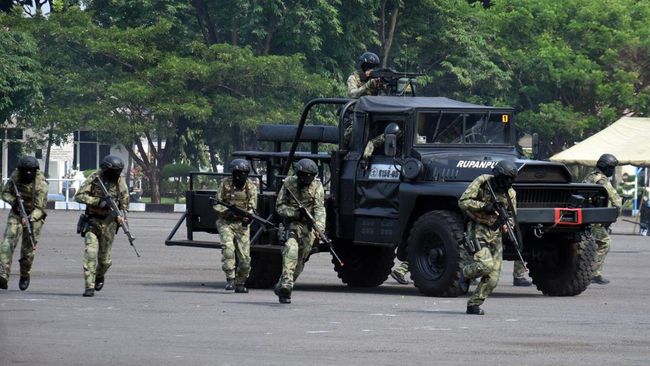 Surabaya - Rupanpur Brigade Infanteri 2 Marinir menggelar demontrasi serangan kilat di lapangan Kesatrian Marinir Sutedi Senaputra Karangpilang, Selasa (05/12/2023).