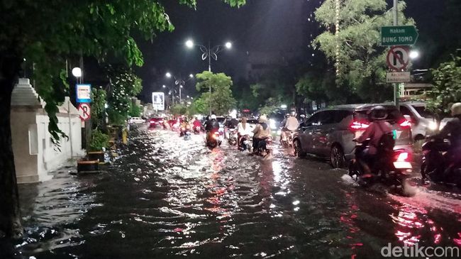 Surabaya - Hujan deras disertai angin dan petir menerjang Kota Surabaya sejak pukul 18.15 WIB, Kamis (7/12/2023).Akibatnya sejumlah jalan tergenang dan pohon tumbang.