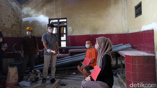 Surabaya - Suprio Handono (31) tersangka pembunuhan istrinya, Fitriani yang mayatnya dicor di dalam rumah menjalani rekonstruksi.
