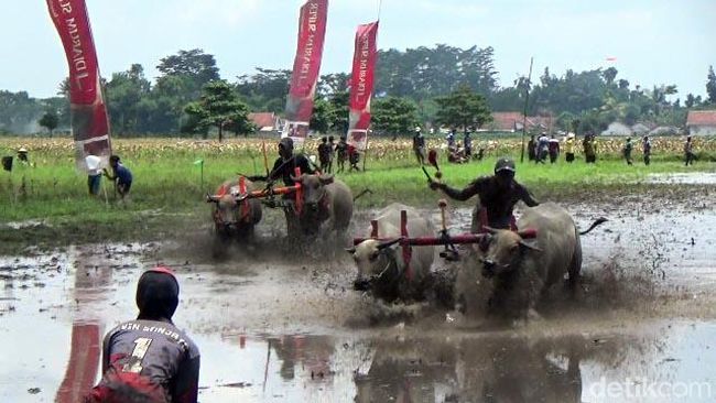 Lumajang - Tradisi balapan kerbau atau karapan kerbau digelar di areal persawahan Desa Dawuhan Wetan, Lumajang jelang penanaman padi, Minggu (17/12/2023).