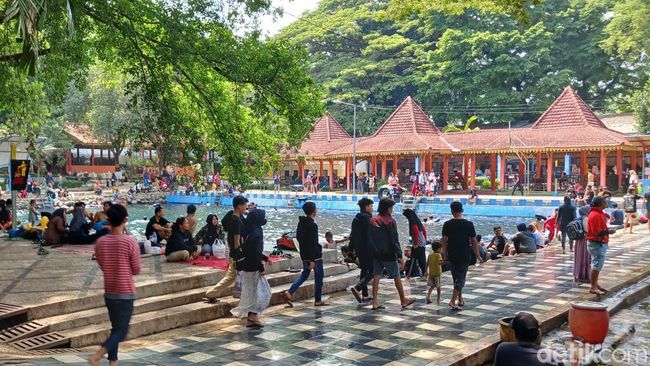 Pasuruan - Wisata pemandian alam Banyubiru, Pasuruan, ramai dikunjungi saat libur Nataru 2023. Pemandian ini menjadi primadona warga sekitar.