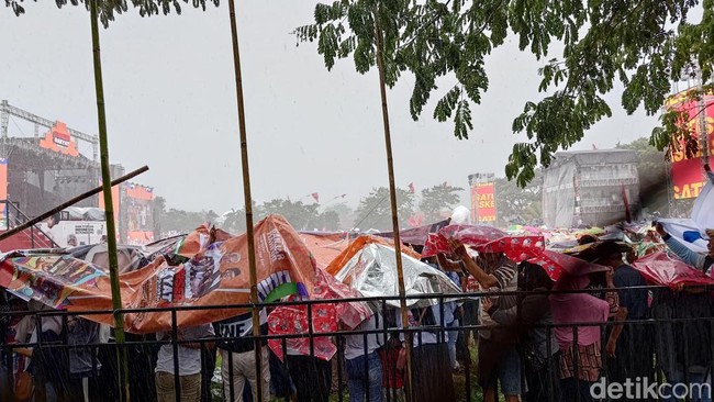 Hujan sempat menguyur lokasi kampanye Ganjar-Mahfud yang berada di lapangan ruang Terbuka Hijau (RTH) Maron, Banyuwangi. Meski begitu massa masih tetap bertahan.